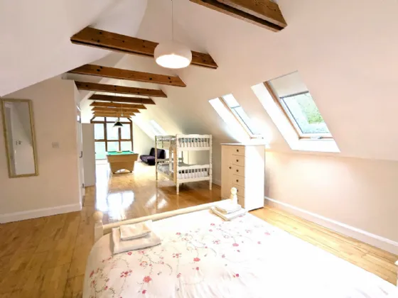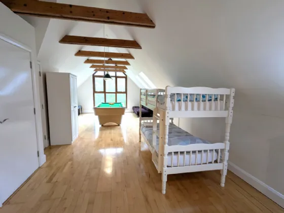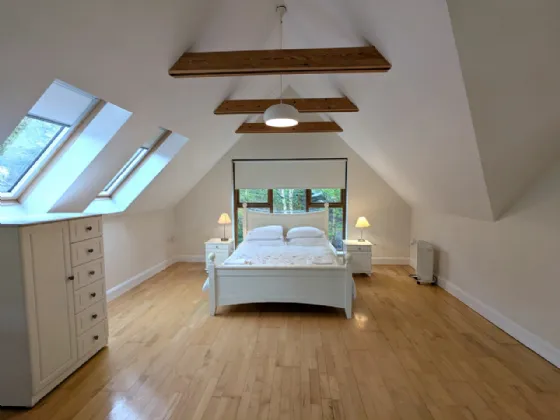 Bedroom Four 4.66m x 4.49m & 3.72m x 3.42m & 4.66m x 4.12m Very substantial room with potential to subdivide, maple floor, vaulted ceiling with open beams, feature window balcony
