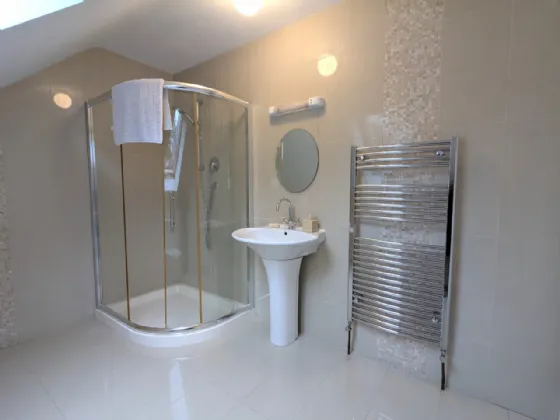 En-Suite 2.39m x 2.2m Tiled floor, part tiled walls, shower, wc, whb, heated towel rail, velux