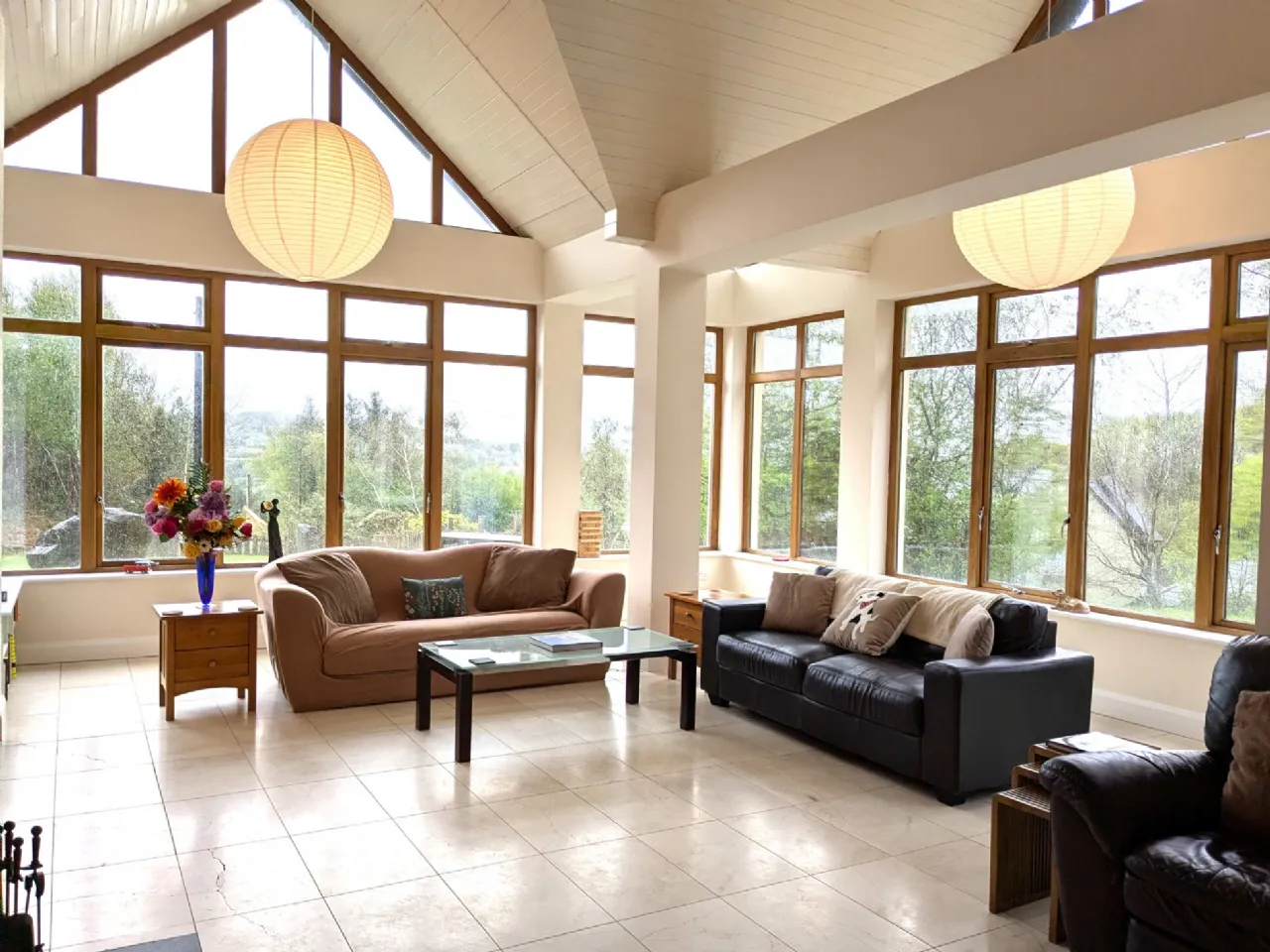 Living Area 8.25m x 5.97m Light filled south and east facing room with vaulted double height ceiling, marble tiled floor, open fireplace