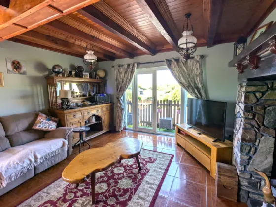 Kitchen/Dining/Sitting Room 5.85m x 4.23m & 3.01m x 2.77m Feature timber panelled and beamed ceiling, tiled floor, stone and timber fireplace with solid fuel stove, storage presses, painted oak kitchen with integrated dishwasher, south/west facing patio doors to front garden with Croagh Patrick viewss