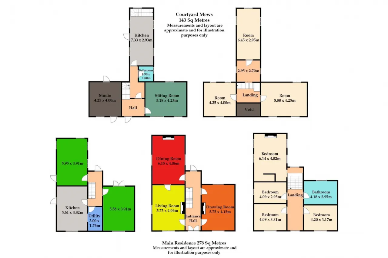 Courtyard Mews (partly converted) Includes entrance hall, sittingroom, bathroom and standalone shower. Stairs leads to first floor where there are 2 rooms. A further stairs leads to a landing and 2 rooms.