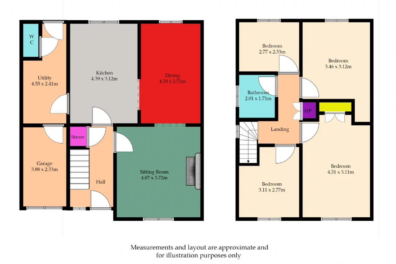 The accommodation includes an entrance hall, a bright sitting room, a separate dining room, kitchen, utility room, and guest WC on the ground floor. Upstairs, there are four generously sized bedrooms and a main family bathroom. The integral garage offers further scope for conversion into additional living space, subject to planning permission.