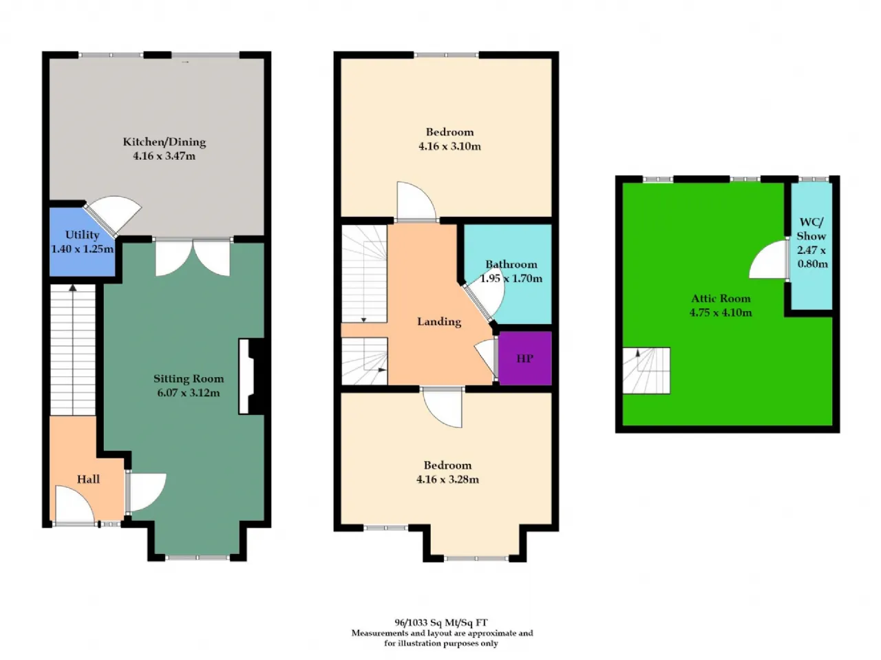 Shower Room Off the attic room with shower unit with Triton Aqua Sensation electric shower, WC, wash hand basin and tiled floor.