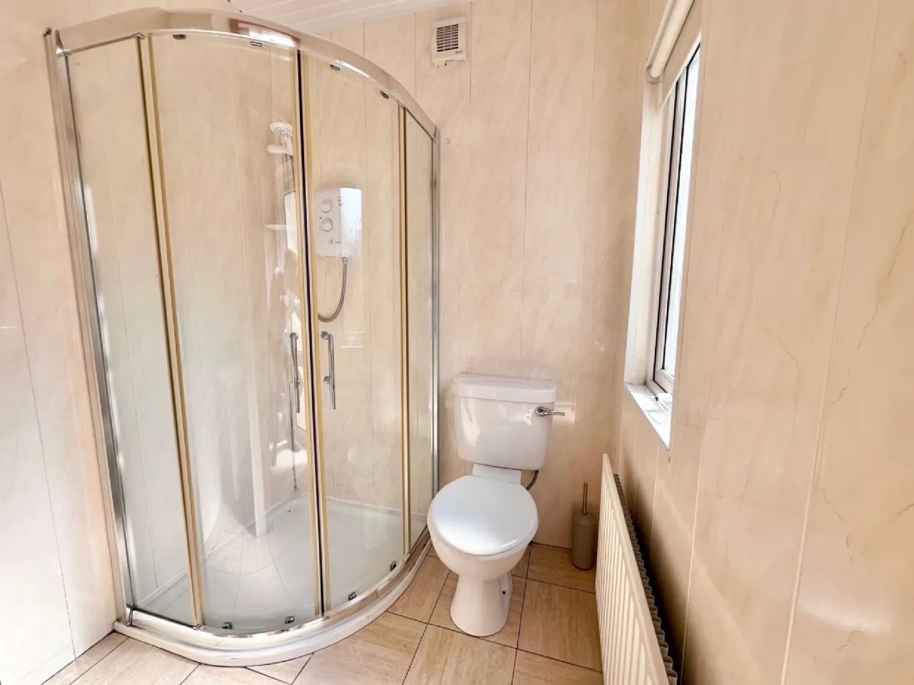 Shower Room: 1.43m x 1.66m Corner shower, pvc walls & ceiling, ex. fan,tiled floor.