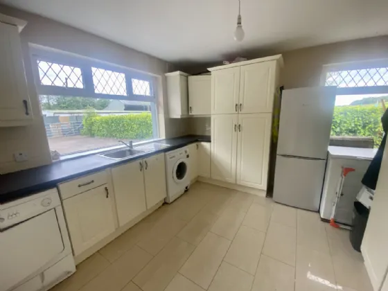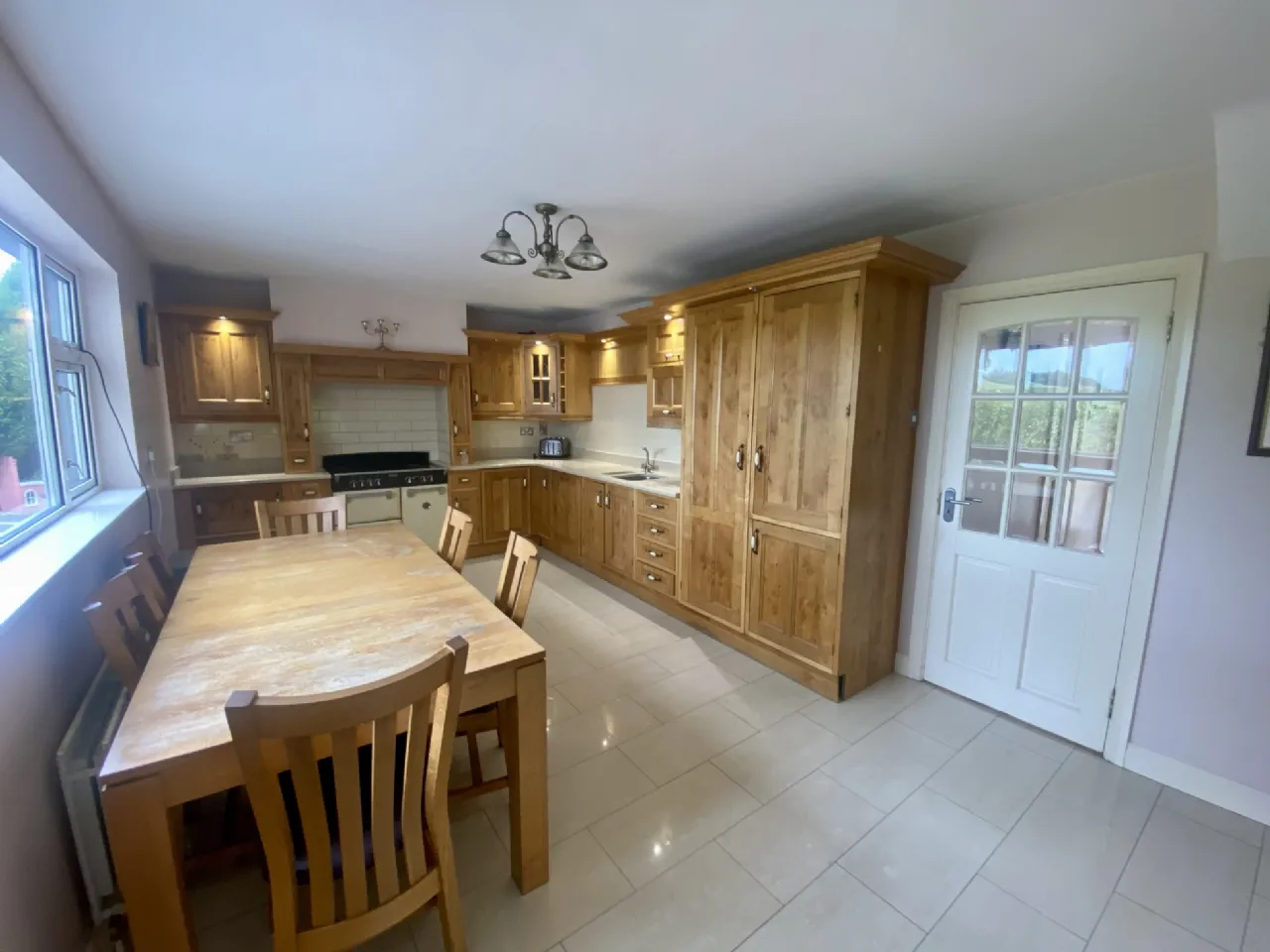 Kitchen Dining Room: 5.45m x 3.33m Country style solid oak cabinets. Quartz worktop. Subway tile splash back. High gloss floor tile.