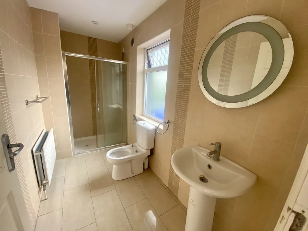 Bathroom: 2.32m x 3.31m Spacious, fully tiled, white & aqua tile scheme. Double shower unit, bath, wc, wash hand basin.