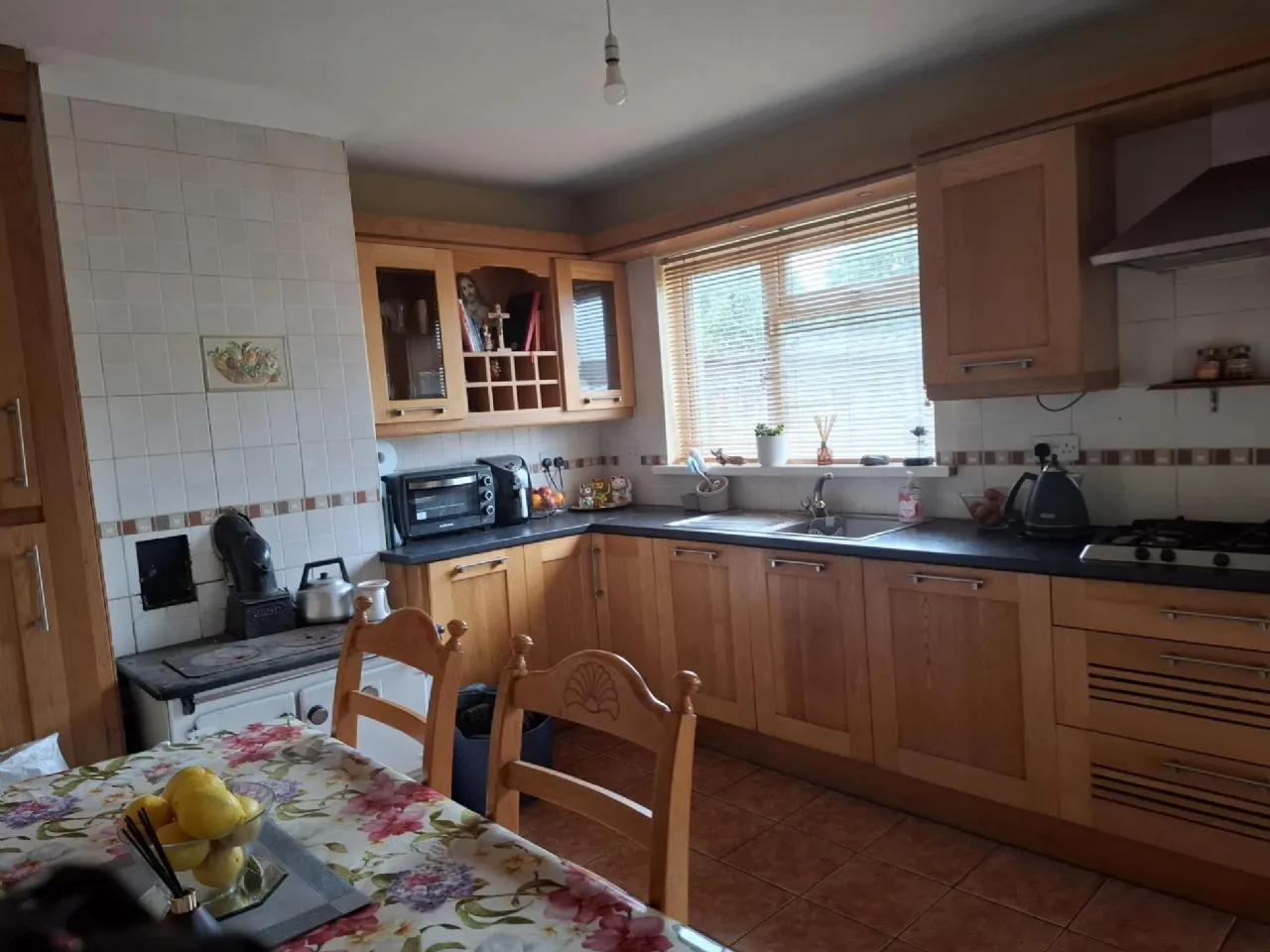 Kitchen/ Dining Room 6.00m x 3.32m With oak shaker style units, five ring gas hob, extractor fan, solid fuel range, hot press, plumbing for washing machine, door to back garden.