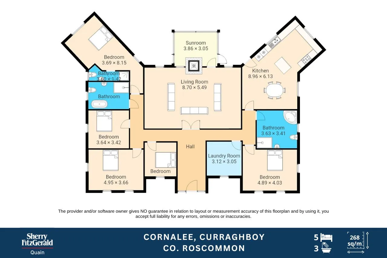 Entrance Hall, Spacious Living Room, Sunroom, Kitchen/Dining Room, Laundry Room, 5 Bedrooms with master ensuite and 2 family bathrooms. There is very generous storage in the attic which is accessible via stira.