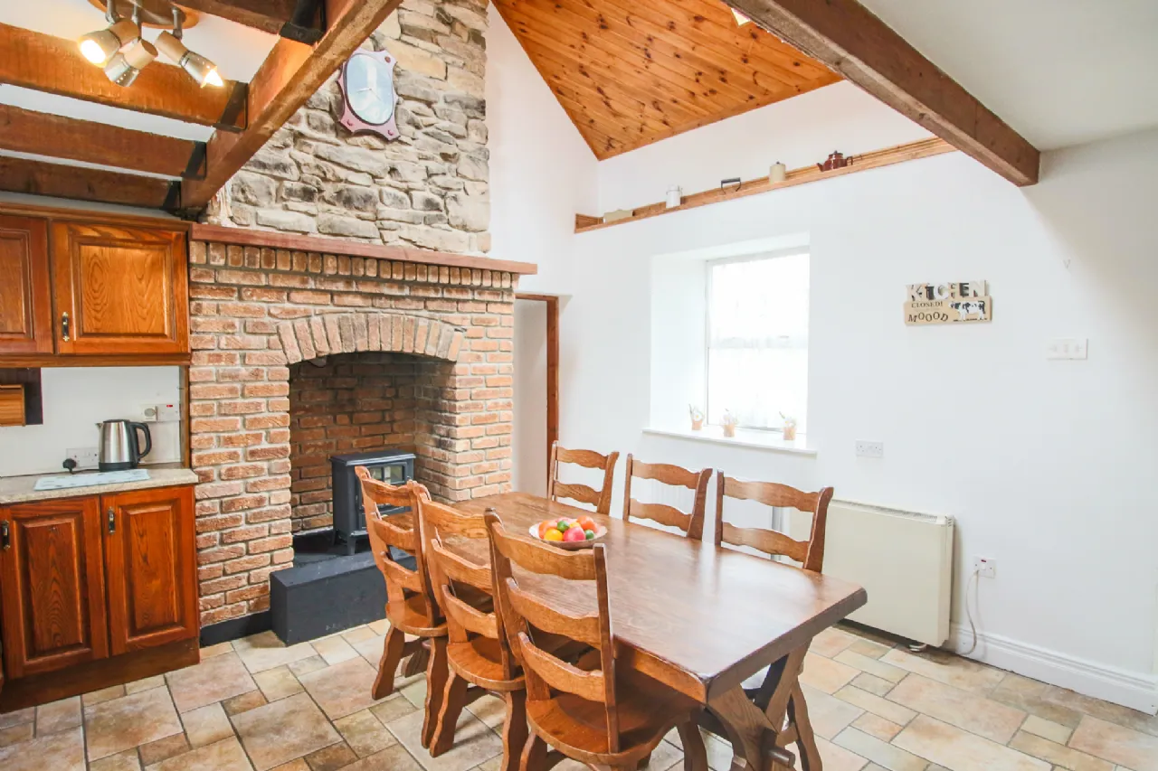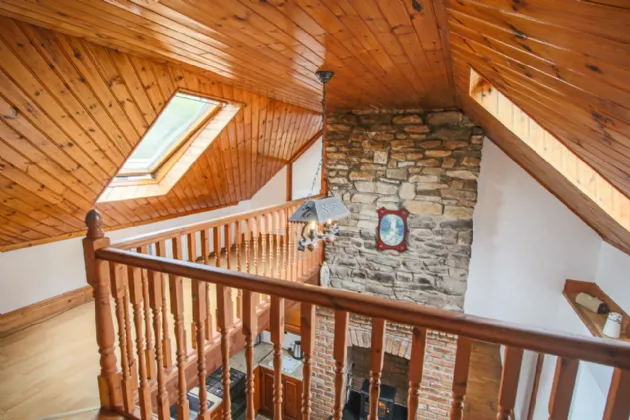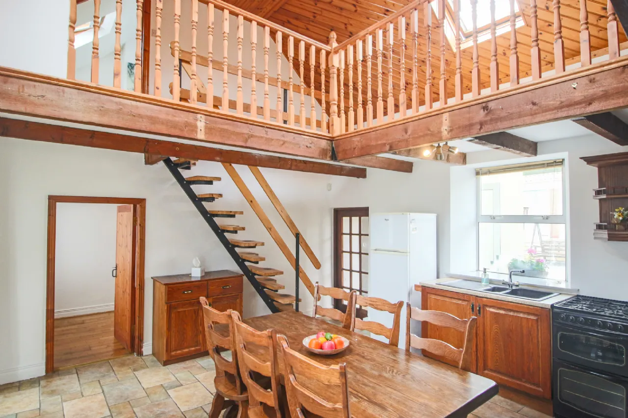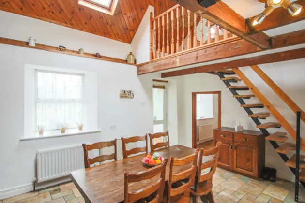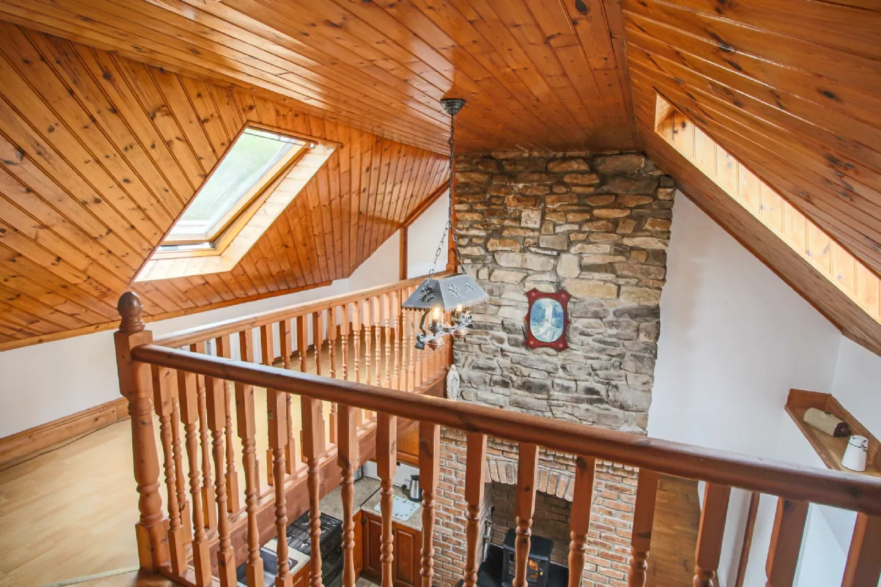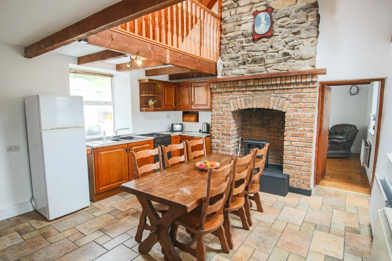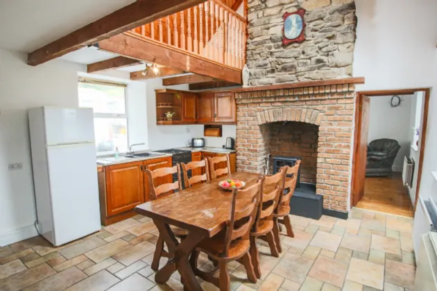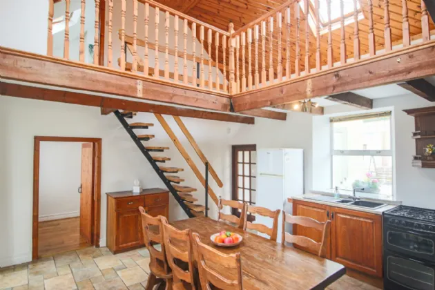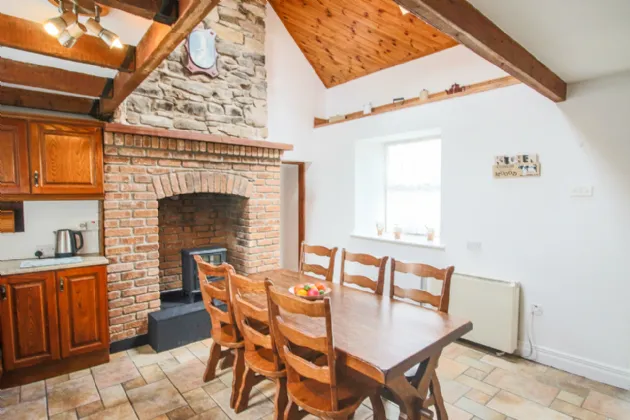 Kitchen/Dining Area 4.78m x 4.17m “Stone" flag floor tiling, radiator, storage heater, feature fireplace with stone chimney breast and brick surround, double height space with open gallery, ornate ceiling light fitting, fitted basin, cupboard units, beamed ceiling feature, electric cooker with double ovens & gas hob, Velux roof lights x 2