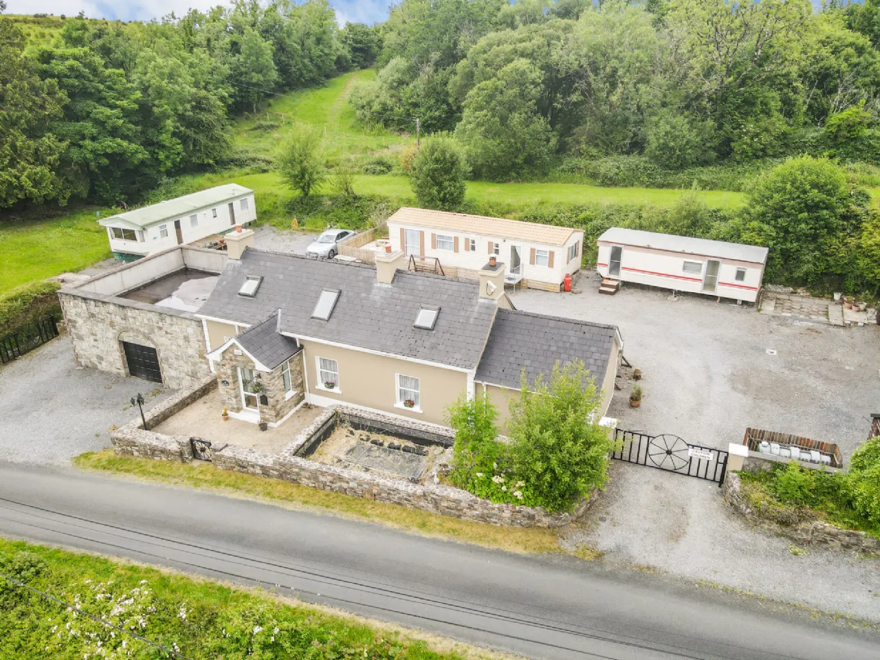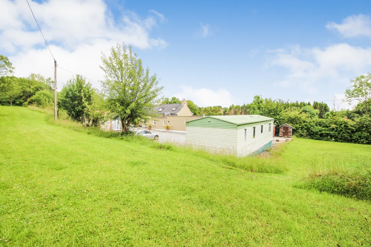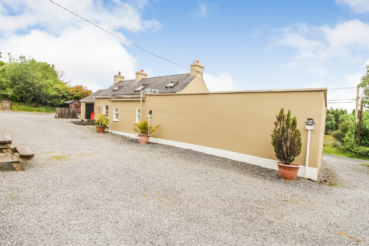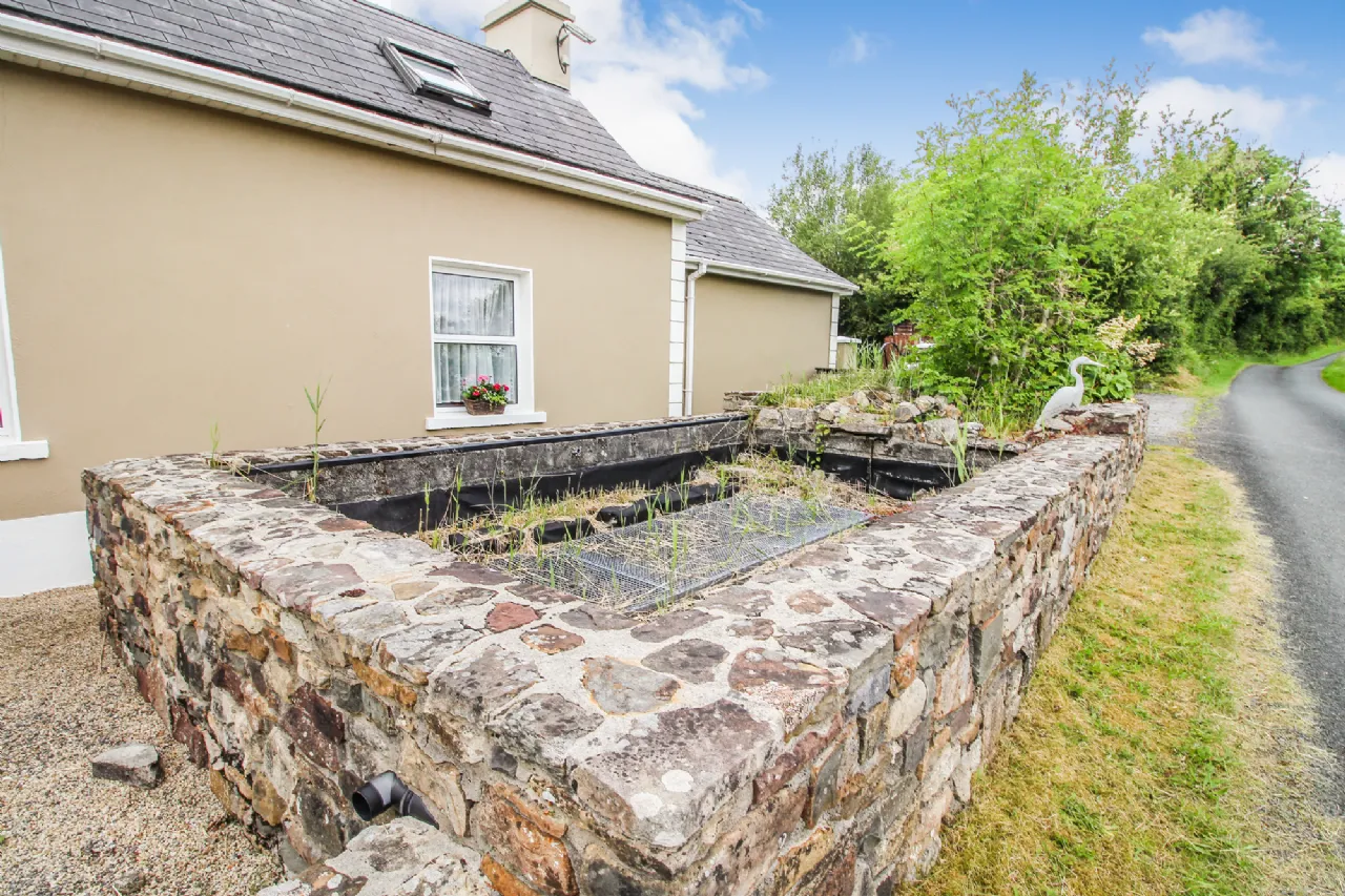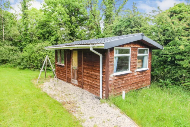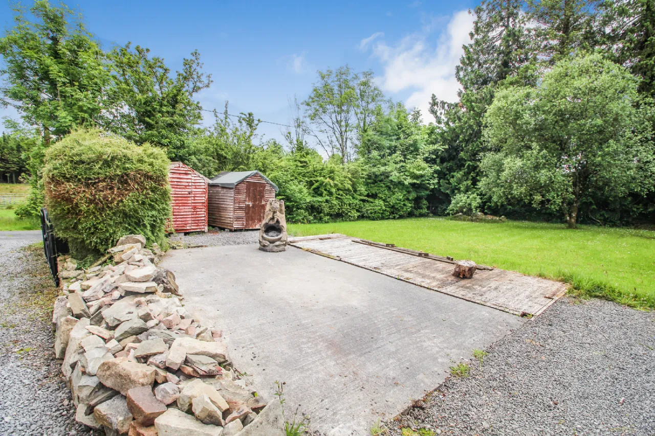 External Grant vortex oil burner, oil tank, gas connection for cooker, bespoke entrance gates with vintage wheel feature x 3, water & electricity connections in rear yard, dual access, Cabin 5.29m x 3.59m, with wood cladding & metal roof, power points, wired for speakers, paved stone patio areas, dwarf stone walling, feature stone pond (no longer in use).