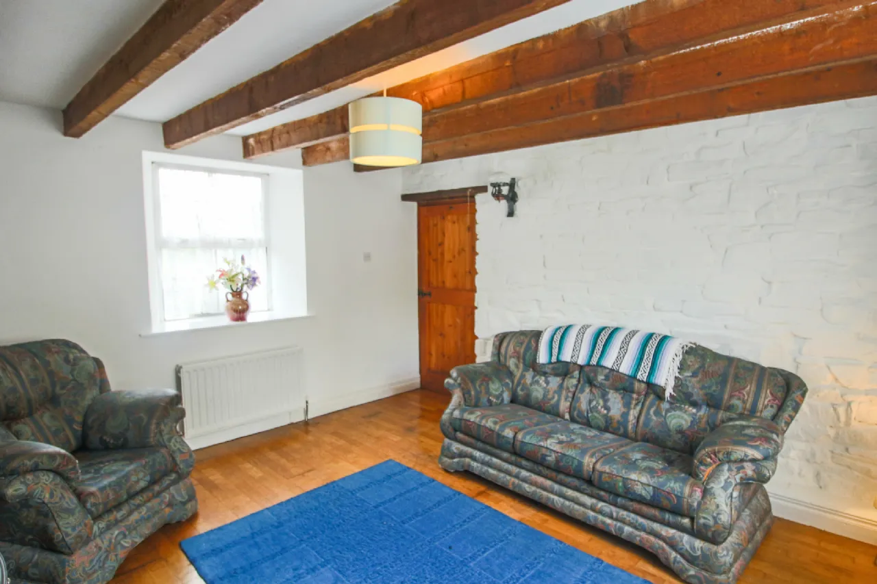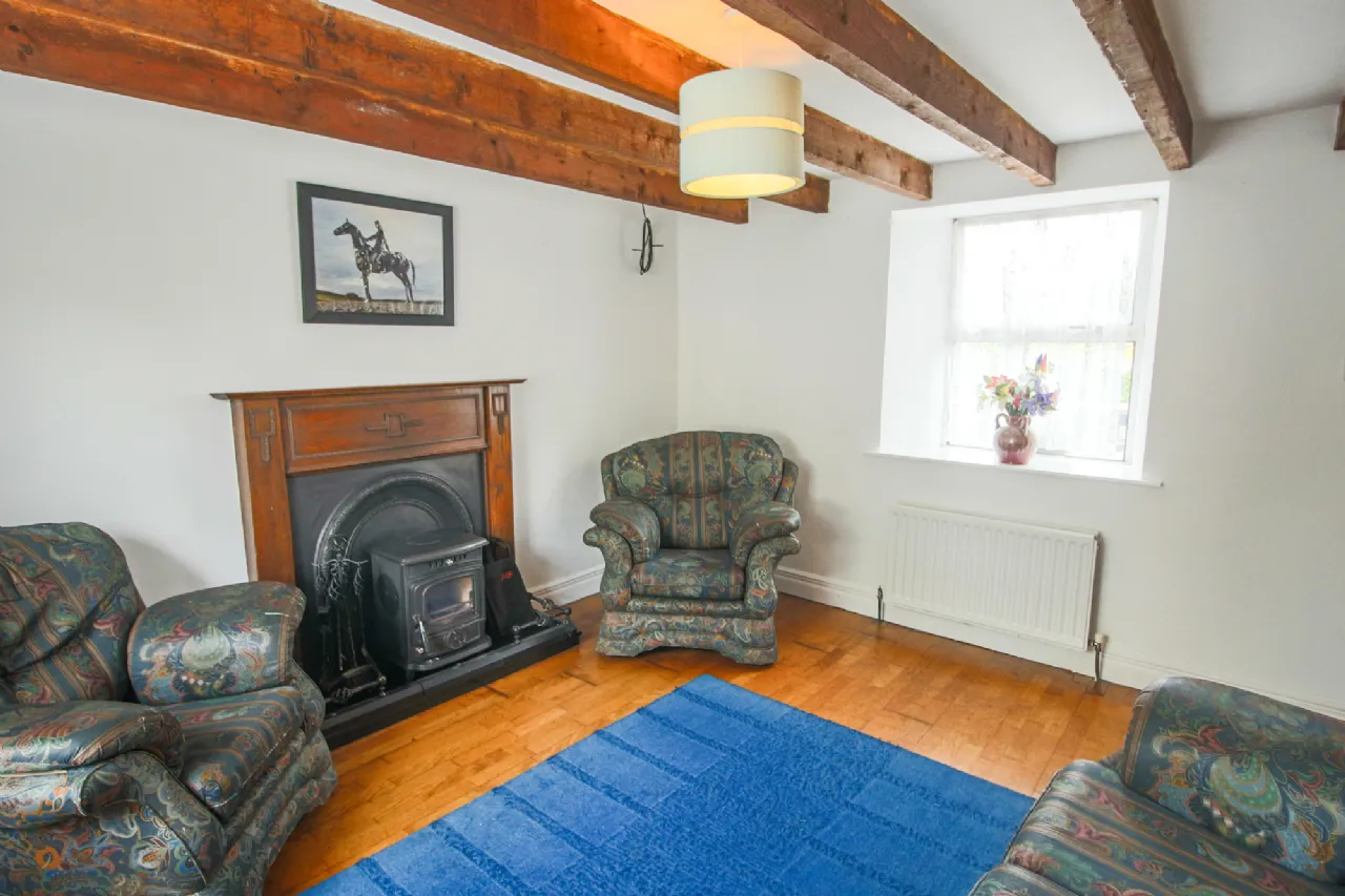 Living Room 4.16m x 3.73m Wood flooring, beamed ceiling feature, fireplace with wood surround, cast iron inset, granite hearth, traditional sheeted door & hardware, exposed stone wall feature, radiator