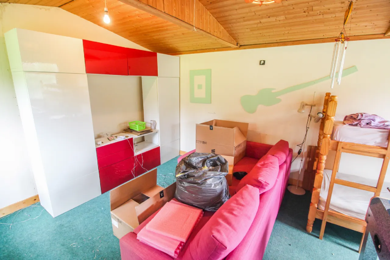 Workshop 4.27m x 4.11m With double doors, concrete floor & drainage, workbench & storage units, ample power points, overhead loft storage