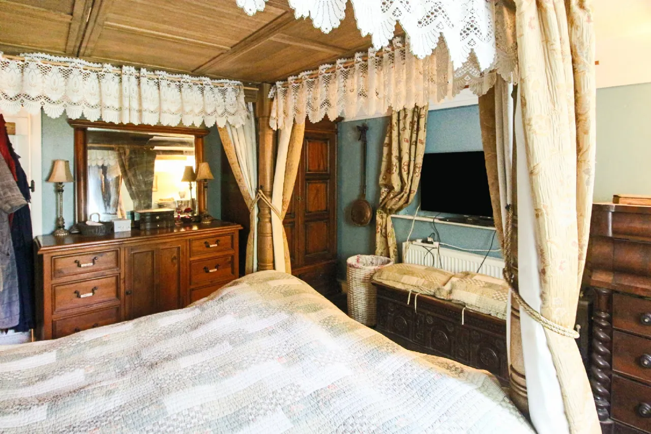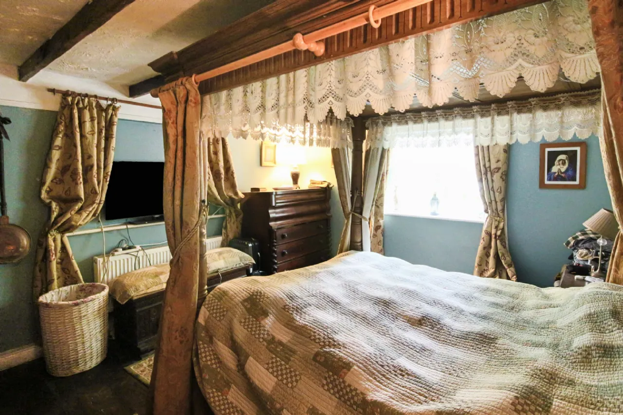 Kitchen/Dining/Living Room 27.45m² (295.47 sq ft) Flagged floor, bespoke 'oak' units with antique brass & porcelain handles, island/breakfast bar with metal hanging rail, integrated Kenwood dishwasher, Belling electric cooker & hob, 'Classic' integrated fridge freezer, feature Tiffany-style light fitting, larder cupboard, beamed ceiling, door with cat/dog flap, standalone solid fuel stove, radiator, recessed TV nook, spot lamps, curtain poles, access to loft space.