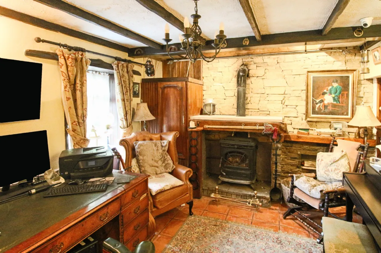 Study / Sitting Room 4.52m x 3.33m Ceramic floor tiling, solid fuel stove on raised plinth with stone surround and wall feature, beamed ceiling with spotlights, shelving and back panelling, curtain poles, metal candelabra