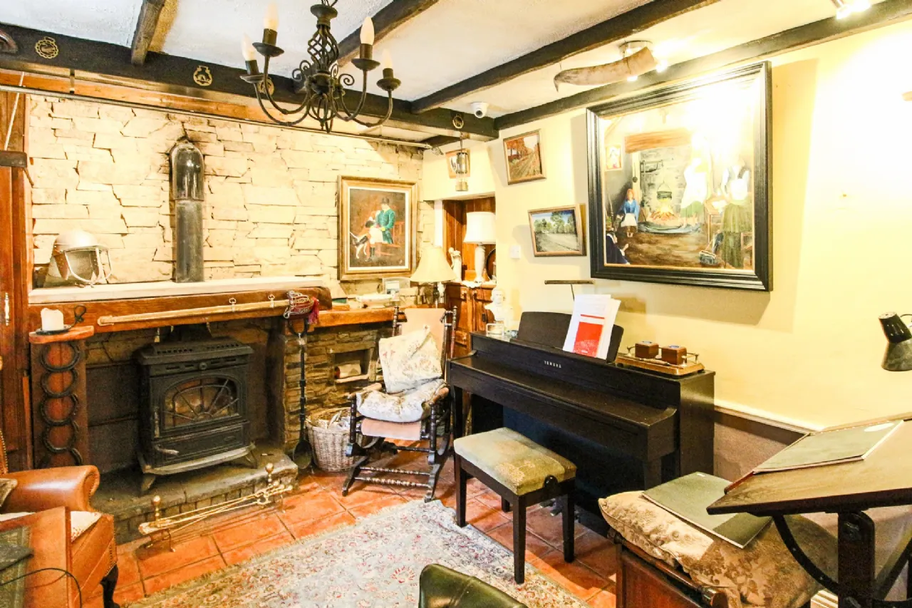 Entrance Hall / Study 4.52m x 3.33m Ceramic floor tiling, solid fuel stove on raised plinth with stone surround and wall feature, beamed ceiling with spotlights, shelving and back panelling, curtain poles & drapes, metal candelabra
