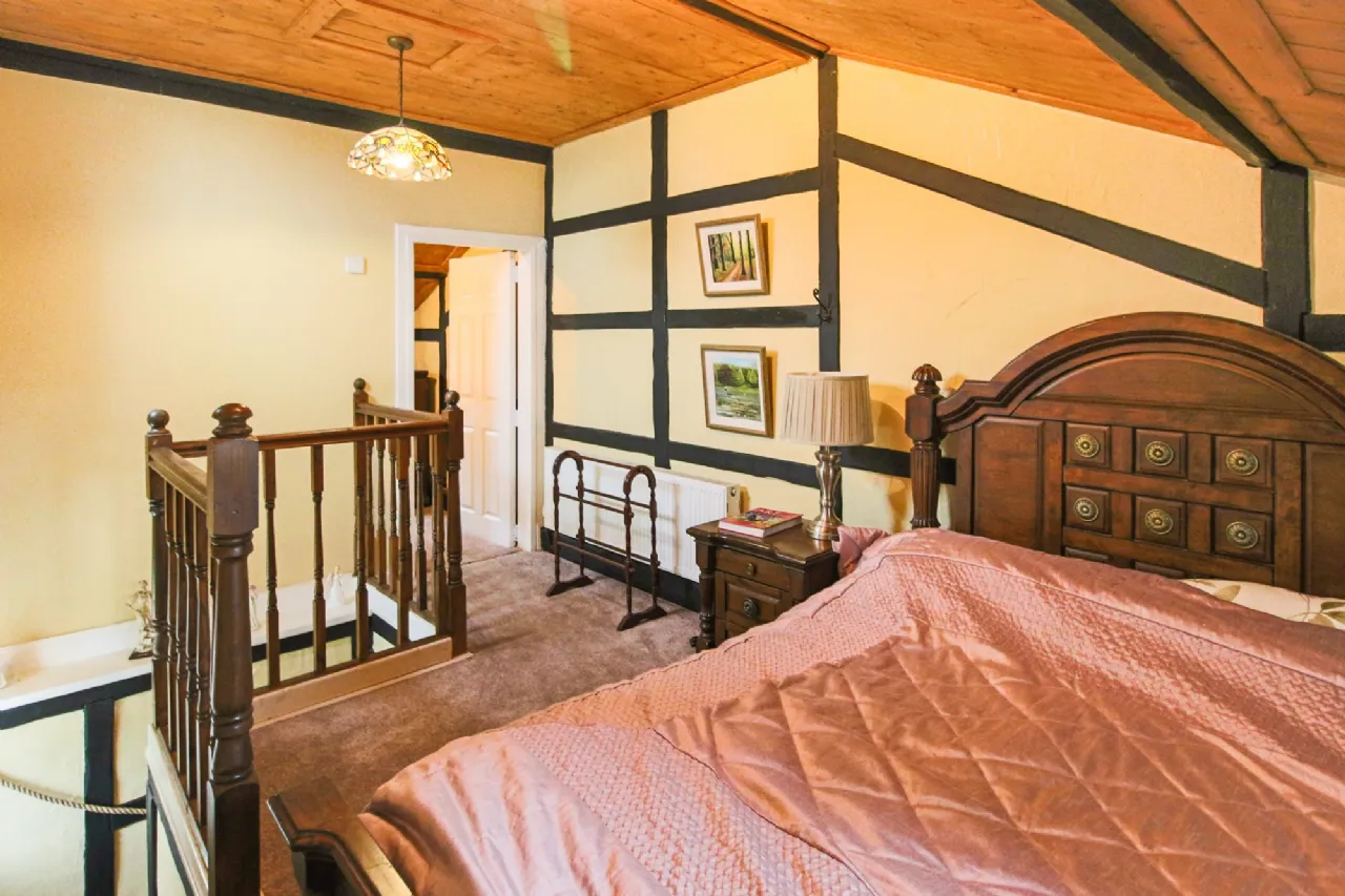 Loft Bedroom (4) 5.1m x 3.05m Tongue & Groove wooden ceiling with slope feature, radiator, carpet to stairs, timber Tudor style wall feature