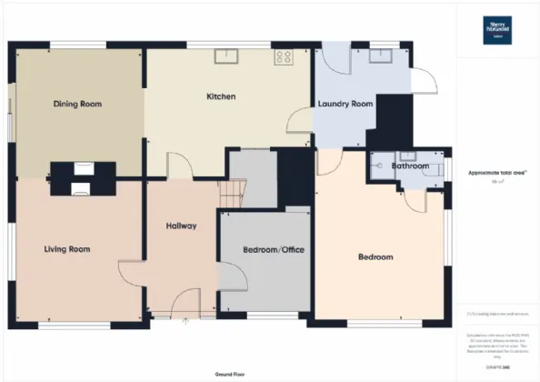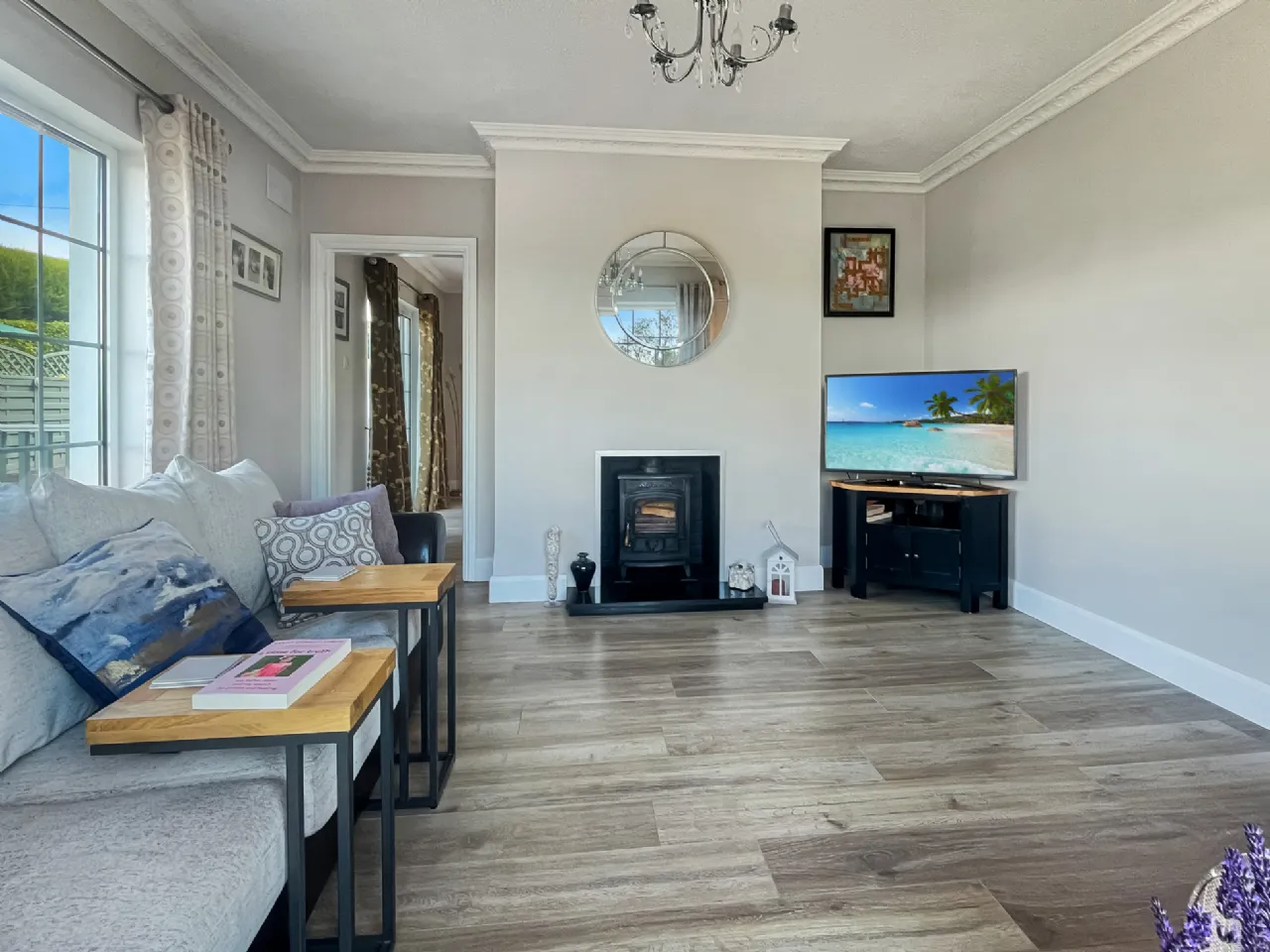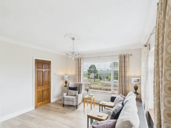 Sitting Room 4.3m x 3.95m with solid fuel stove, laminated floor, coving, centrepiece and door to Living Room/Dining Room