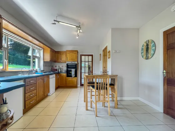 Kitchen/Dining Room 5.0m x 4.0m with oak fitted kitchen, gas hob, electric oven, hot press and tiled floor