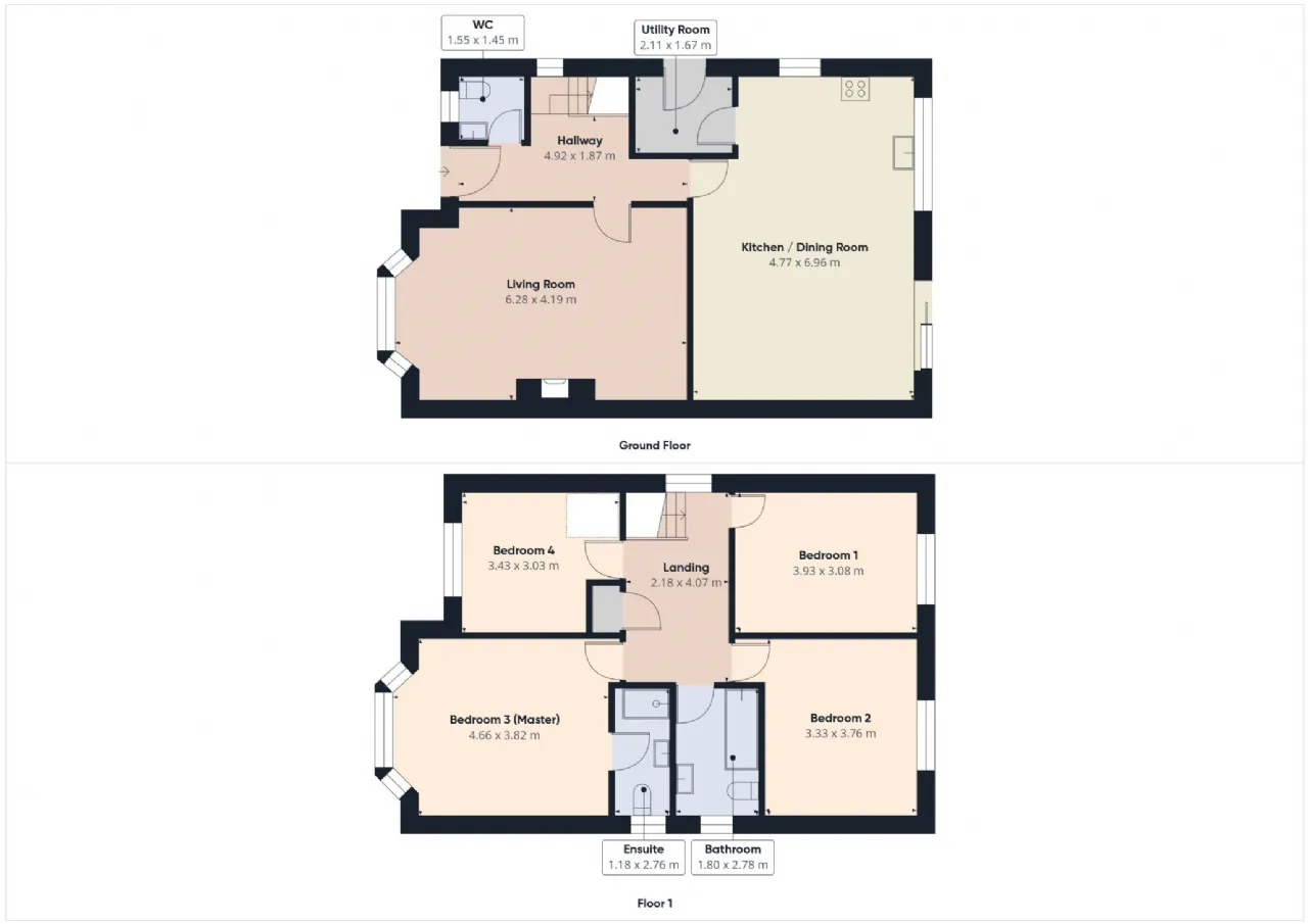 Upstairs there are four bedrooms, all with built in wardrobes. The master bedroom includes an ensuite bathroom while a fully tiled family bathroom with bath and electric shower serves the remaining rooms.