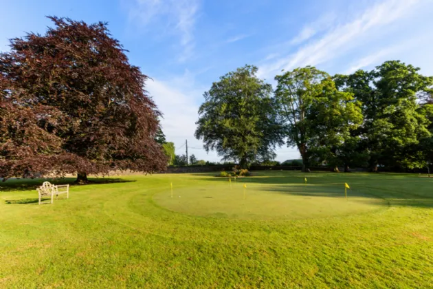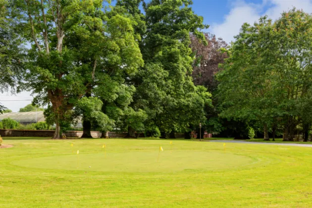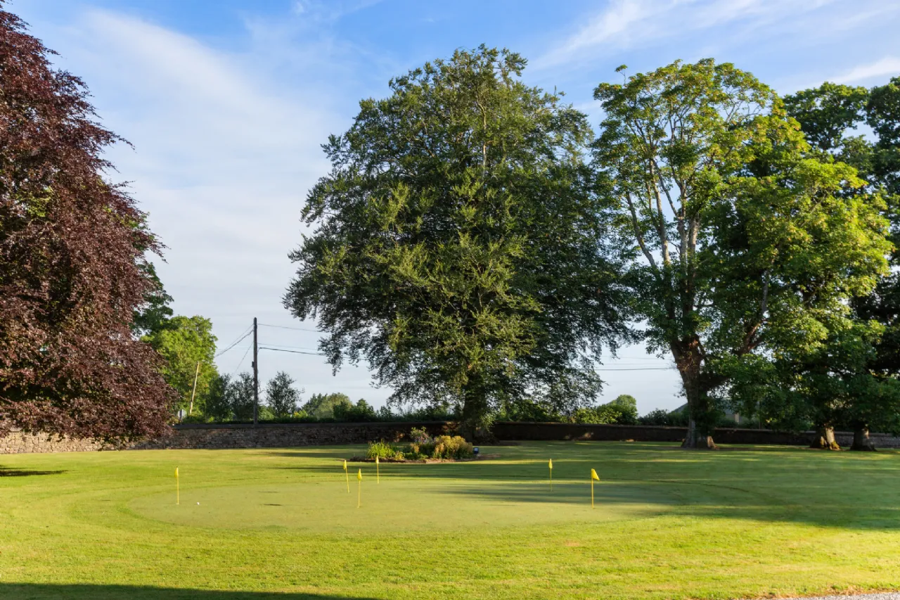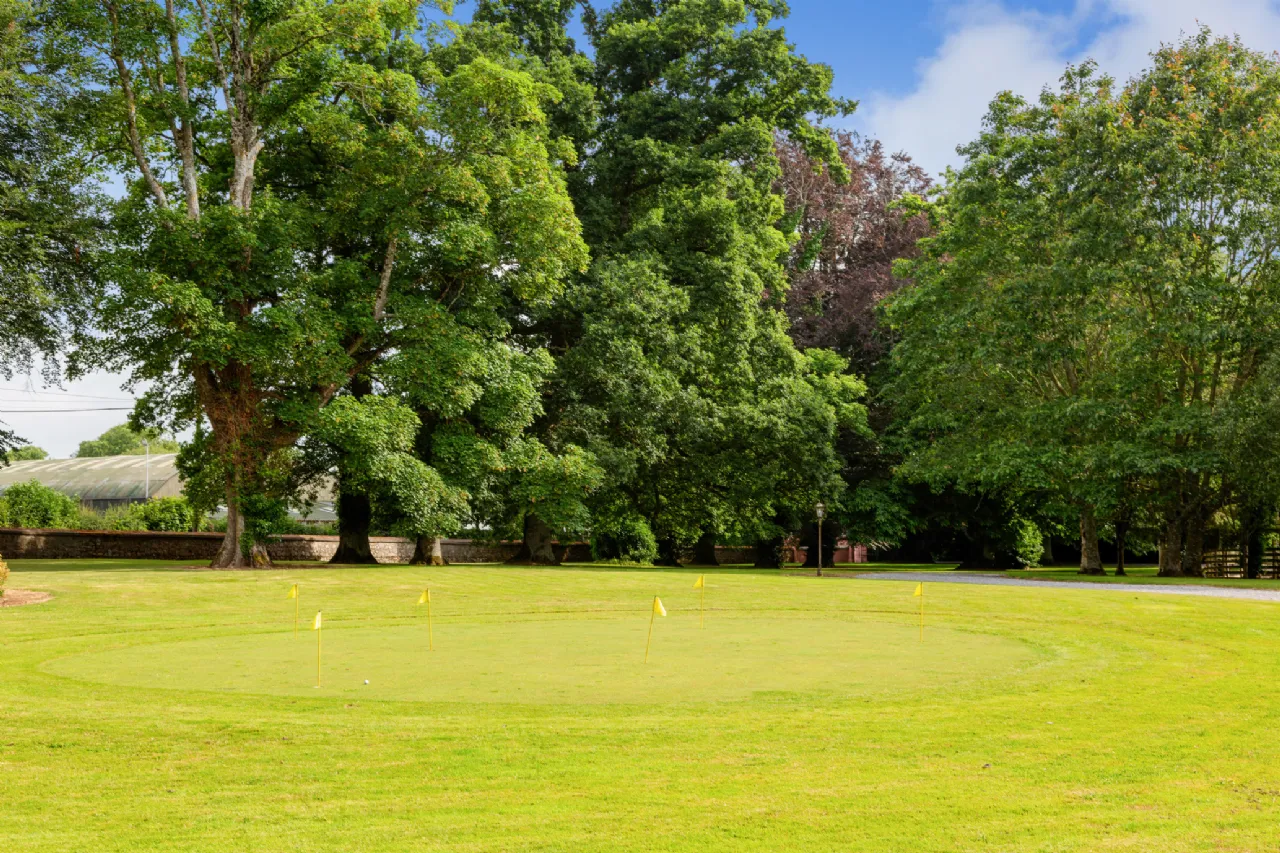 In the front lawn, a well-maintained putting green provides a delightful recreational area for golf enthusiasts to practice their skills in the comfort of their own home.