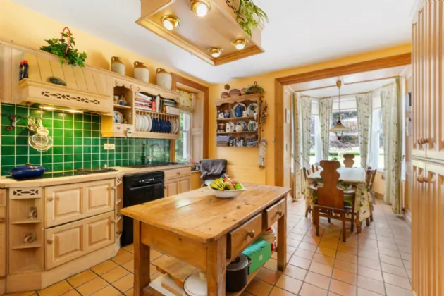 An inner hall guides you to a secondary entrance hall in the original wing of the house, where another staircase provides access to the upper levels. Off this hall, you find a cozy sitting room, more intimate in scale. The room’s centrepiece is a stove that radiates warmth throughout the space, making it the perfect spot for family time. Opposite the sitting room is the kitchen, which boasts a range of fitted units, an island unit and a designated dining area eased into a deep bay window, combining functionality with style. Adjacent to the kitchen are the domestic offices, which include a utility room, ample storage space, and a WC, adding convenience and practicality to the home’s layout.