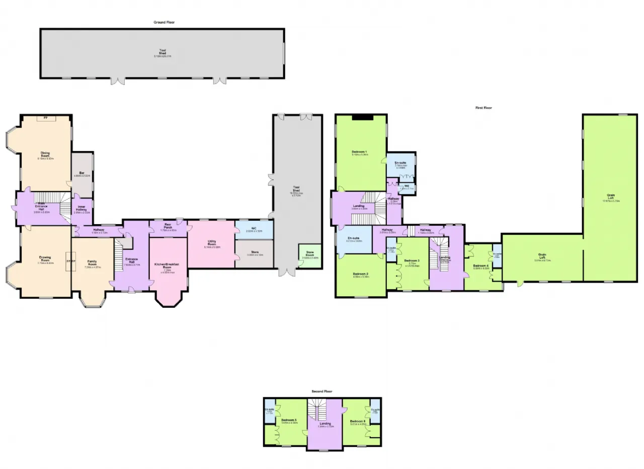 Adjoining the main house is an old stone grain store, complete with a loft upstairs as well as a coach house. These structures offer immense potential for further development, whether as further living space, additional residential accommodation or for various ancillary uses, all contingent upon obtaining the necessary planning permissions.
