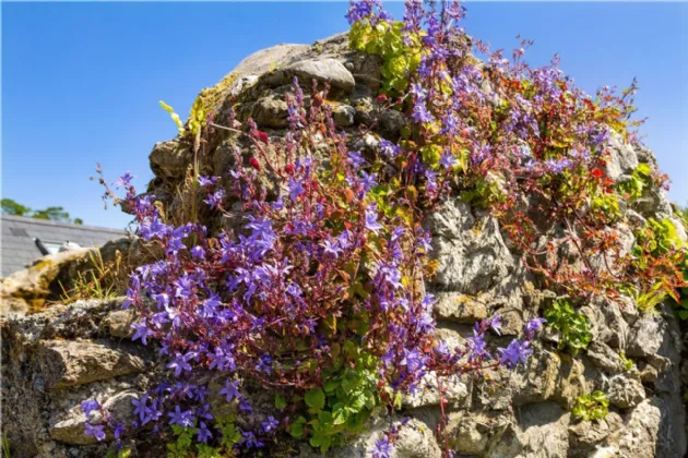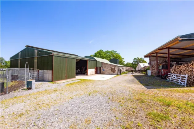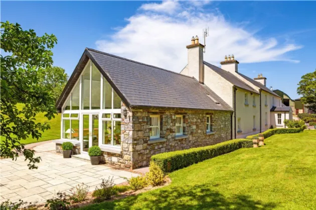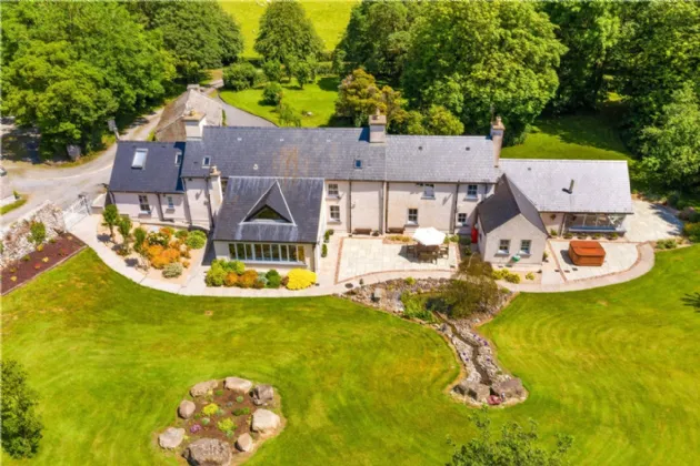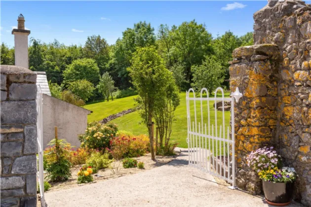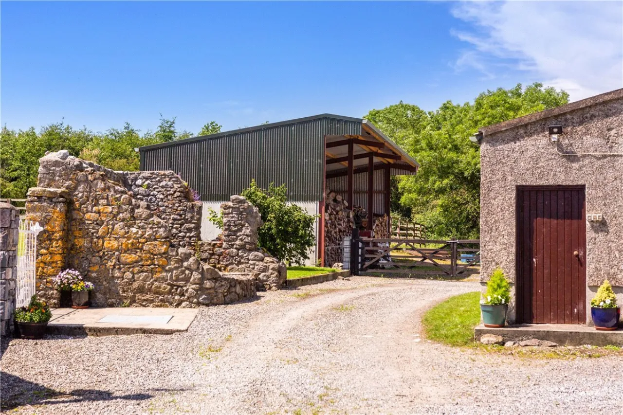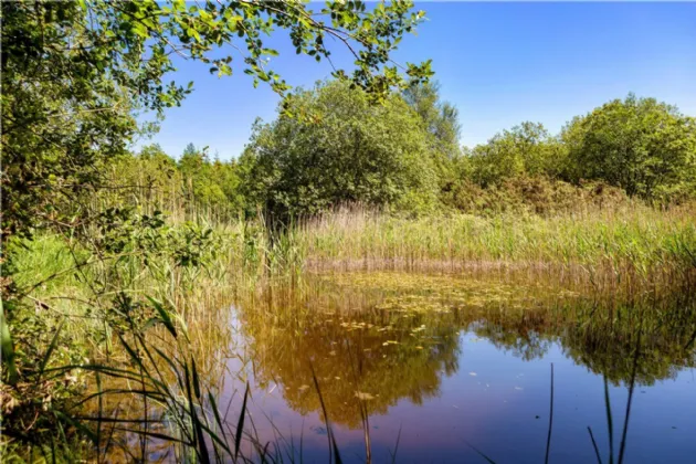 Set on an extremely generous c.27ha(67acres) approximately, Ballydonagh House itself is perfectly positioned on its site for maximum peace and privacy. Patios wrap around the property, with sheltered seating areas. These give views on to charming planting and undulating lawns, the atmospheric remains of old stone walls, and an ornamental pond.
