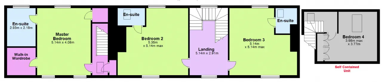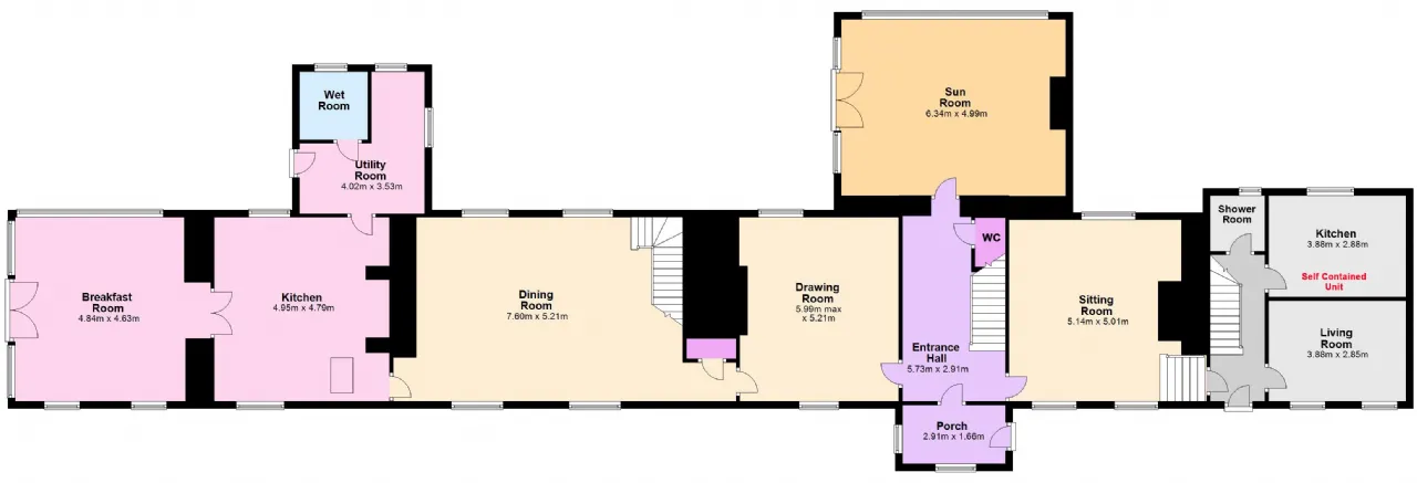 There is also a self-contained suite, which although part of the house, also has its own entrance. This comprises a shower room, kitchen and living room, and a bedroom upstairs, and offers great flexibility in terms of a staff flat, guest house, holiday rental or au pair room.