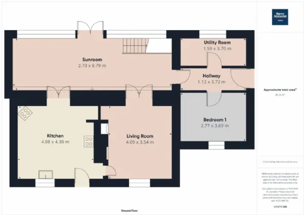 Kitchen 4.3m x 4.08m tiled flooring, fitted kitchen units, belfast sink, range and plumbed for washing machine