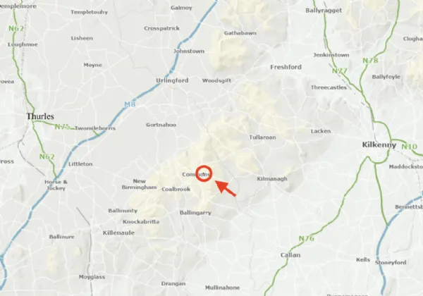This property occupies a stunning elevated site in a most peaceful and tranquil rural location, just 1km from the village of the Commons, 6km from Ballingarry, and 22km from Kilkenny City. It is also situated just 26km from Thurles and 17km from the M8 Dublin / Cork Motorway Interchange at Urlingford, Co. Kilkenny.