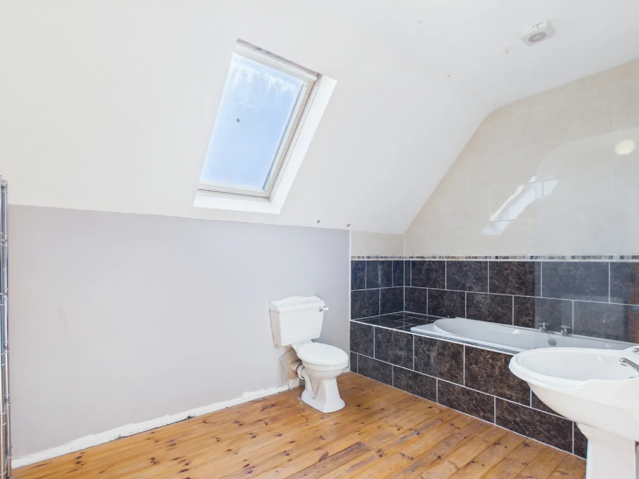 Bathroom 3.87m x 2.49m With W.C, W.H.B, Bath/electric shower and timber flooring