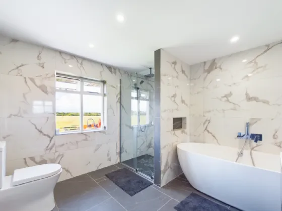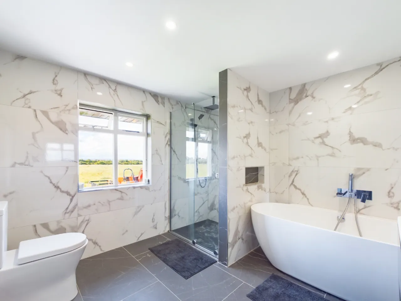 Bathroom 2.93m x 3.08m Modern Bathroom with W.C, W.H.B, bath, shower and tiled floor to ceiling