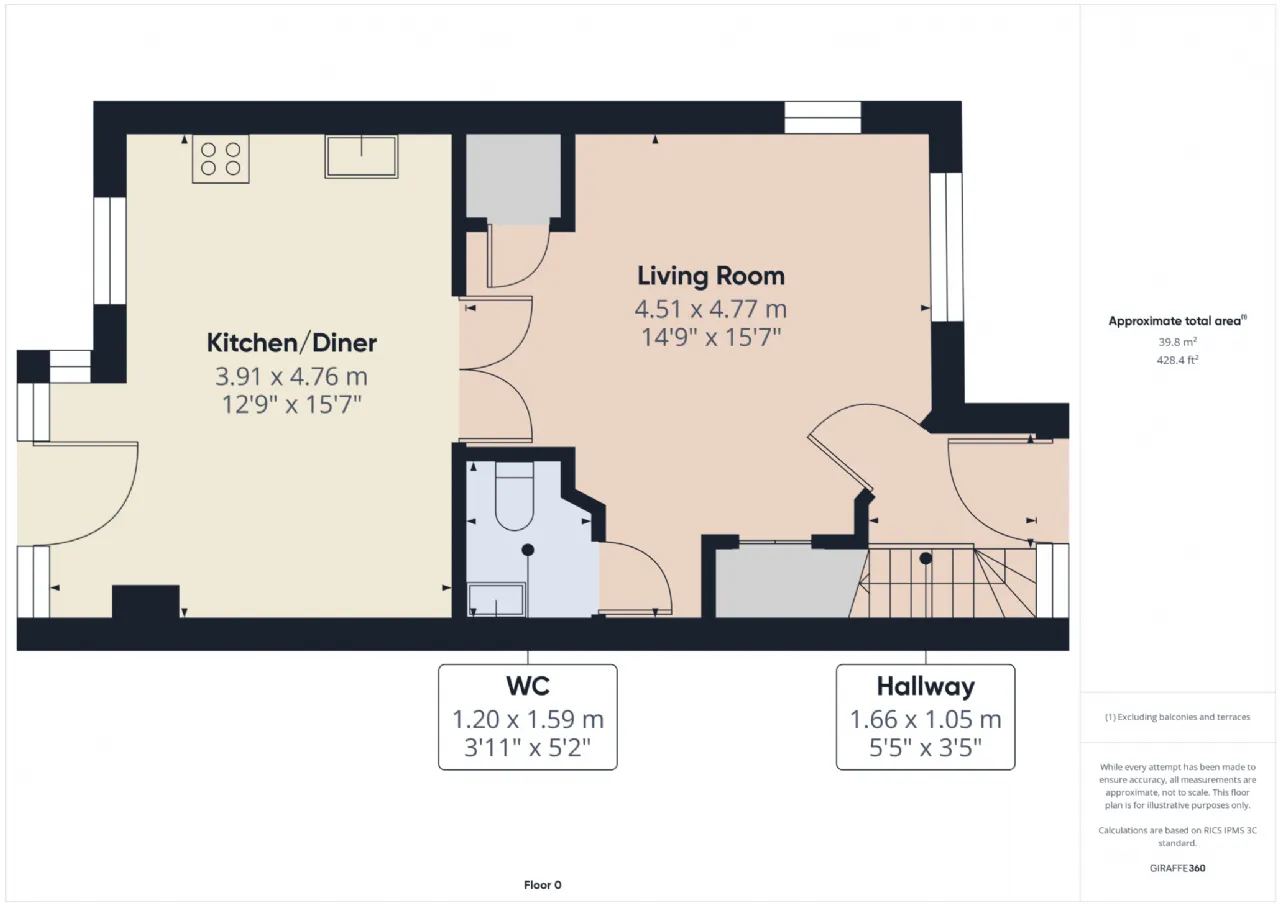 Kitchen/diner 3.91m x 4.76m Laminate floor; tiled floor in kitchen area; integrated hob & oven; blinds; frosted windows; door to rear.