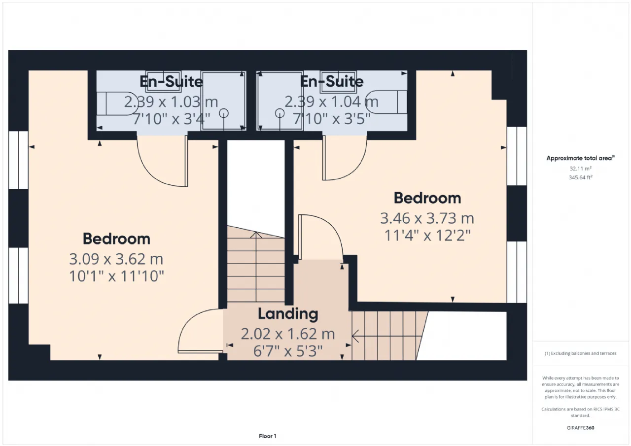 En-Suite 2.40m x 1.03m Tiled floor-to-ceiling; WC; wash hand basin shower.