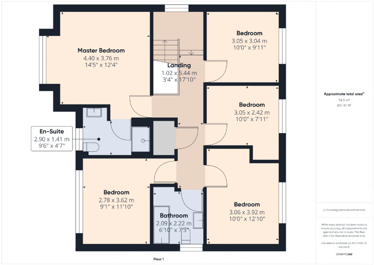 Master Bedroom 4.40m x 3.76m Front orientation; large double room; laminate floor; curtains; blinds; bay window; en-suite.