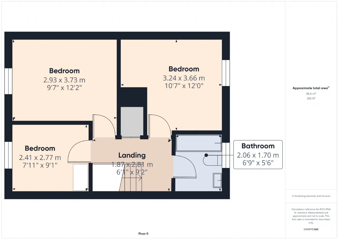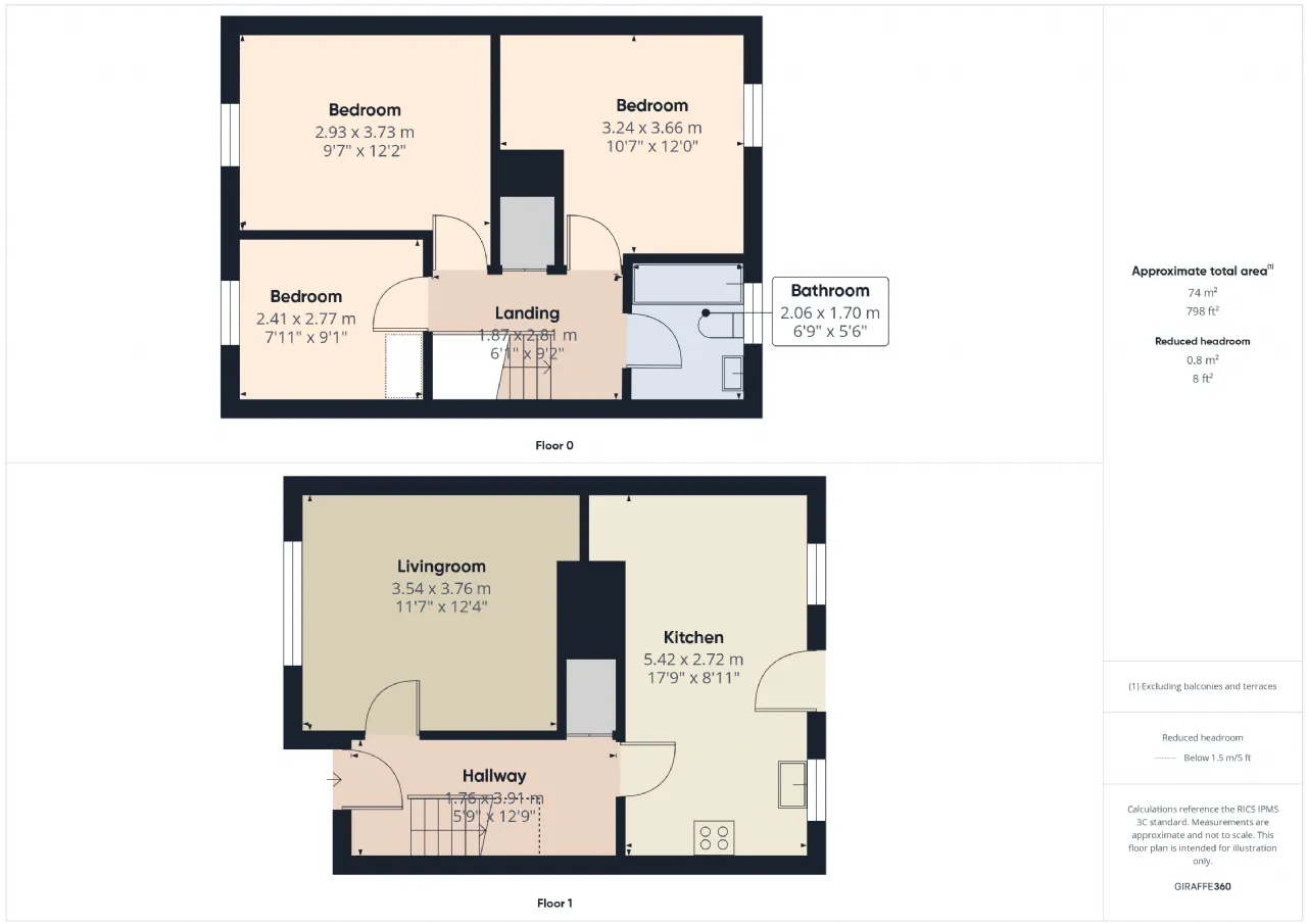 Upstairs carpet flooring on the stairs and hallway, with floor to ceiling tiled family bathroom, W.C., sink and electric shower.