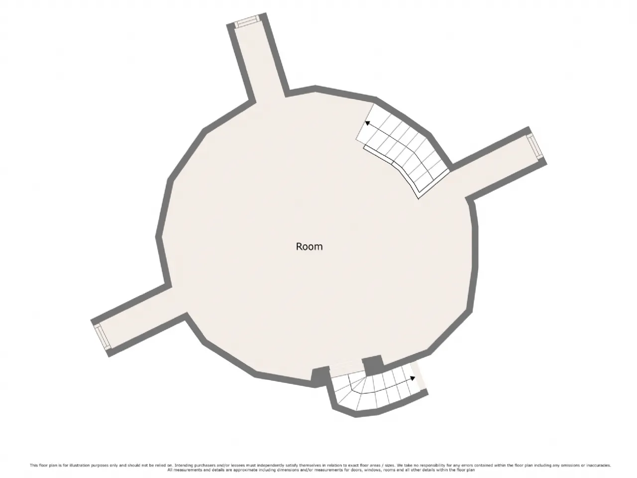 Room 4 (Living Room) 6.2m x 6.5m approx. (20'4" x 21'4" approx.): Circular room with cobble lock floor, raised fireplace with open fire, door to rear, access to two stairwells one leading to basement, one leading to upper floor