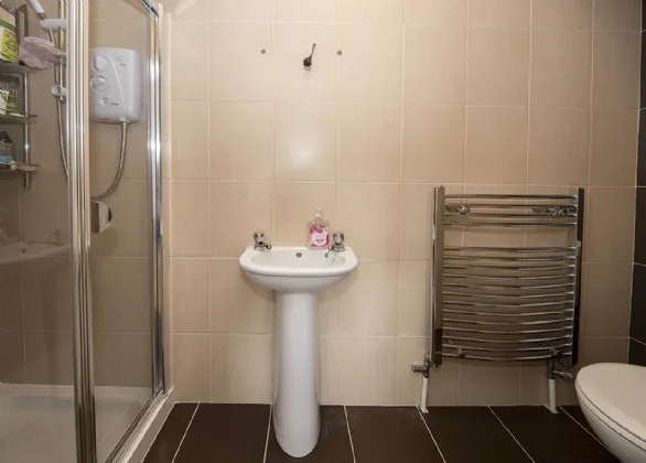 Ensuite 0.84m x 2.77m Tiled floor, walls tiled, whb, wc, Triton el.sh., heated towel rail.