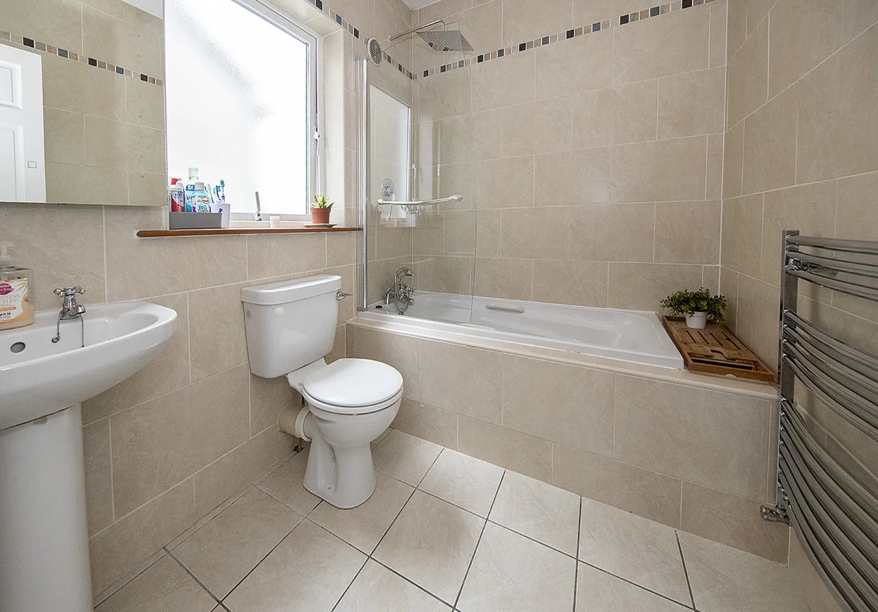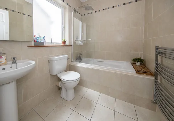 Bathroom 2.34m x 1.96m Tiled floor, walls tiled, window with opaque glass to the side, whb, wc, bath, power shower, centre light, heated towel rail.