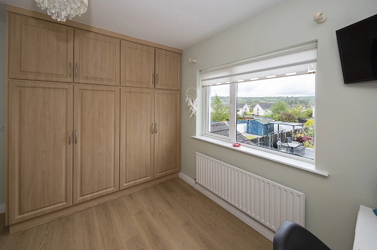 Bedroom Two 3.56m x 3.38m Semi solid timber floor, walls painted, window to the rear with curtains and blinds, centre light, tv point, telephone point, fitted wardrobe.