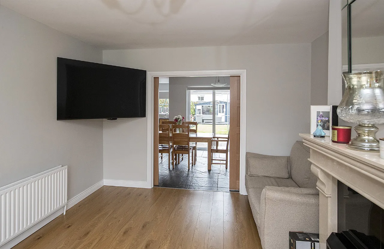 Living Room 5.16m x 3.45m Solid oak floor, walls painted, bay window to the front with curtains and blinds, centre light, fitted Stanley stove, telephone point, tv point, sliding oak doors to the kitchen.