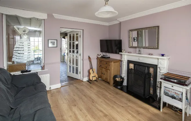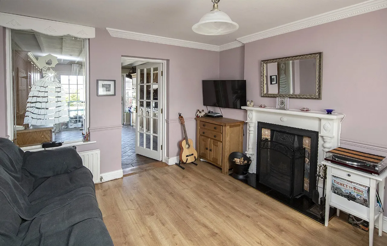Living Room 5.44m x 3.66m Semi laminate floor, walls painted, window to the front with net curtains and curtains, centre light, open fireplace, telephone point, TV point, door and window to kitchen.