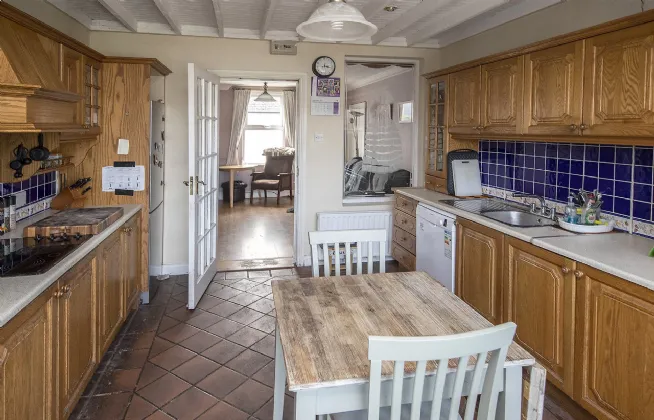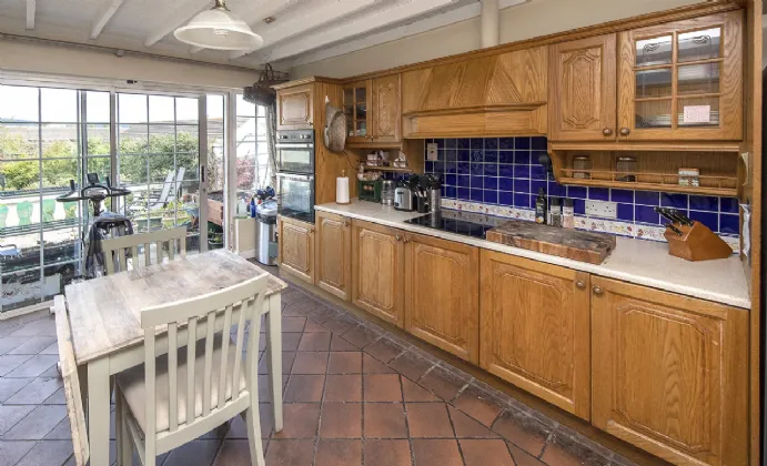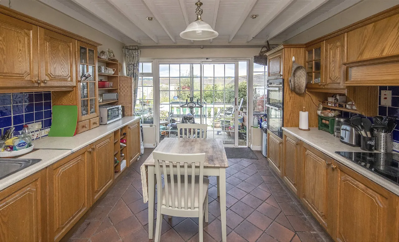 Kitchen 4.45m x 3.43m Tiled floor, walls painted, tiled over units, glass facade to the rear, sliding glass door to the rear, centre light, fitted kitchen solid oak, ceramic hob, plumbed for dishwasher.