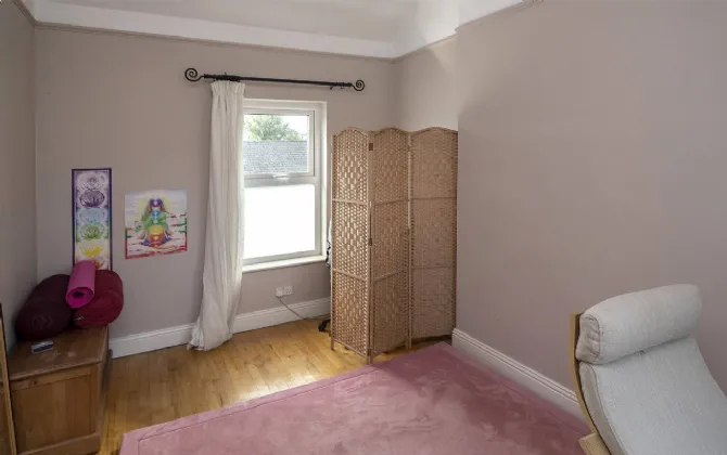 Bedroom Three 3.86m x 2.82m Floor solid oak, walls painted, window to the front with net curtains and curtains, centre light.