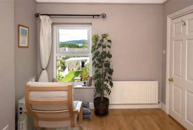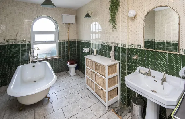 There is one bedroom on the ground floor which has access to the utility room that also has a door to the rear. The main bathroom is unique and deceptive. Accessed via a door by the stairs, this room opens into a large fully tiled bathroom with a free-standing designer bath tub.