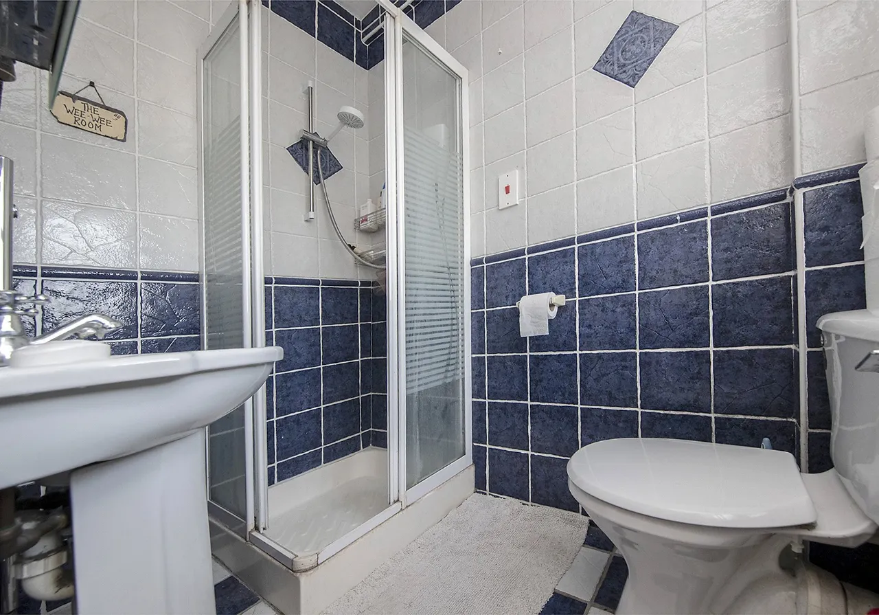 Shower Room 2m x 1.24m Floor tiled, walls tiled, window to the rear with opaque glass, whb, wc, electric shower, centre light.