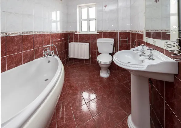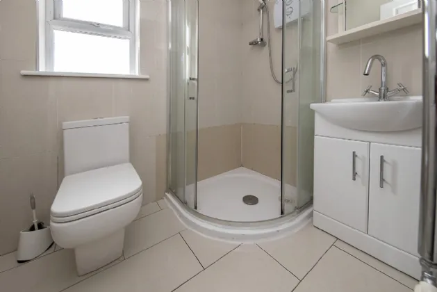 Bathroom 2.24m x 1.93m Tiled floor, walls tiled, opaque window to the front, whb, wc, bath with overhead shower, centre light, shaving light.