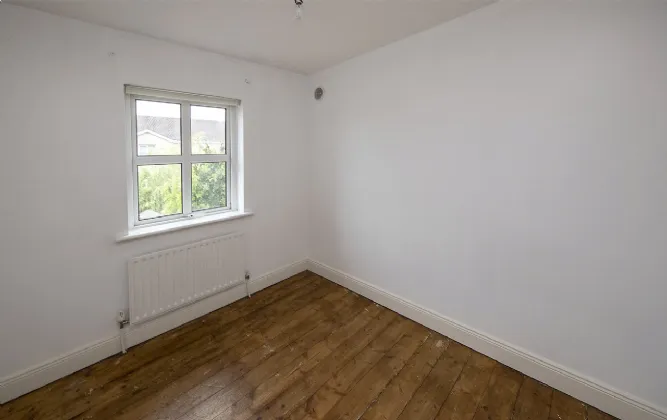 Bedroom Three 2.74m x 2.46m Solid timber floor, walls painted, window to the rear with curtains, centre light.