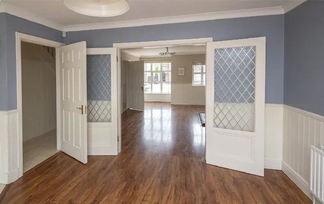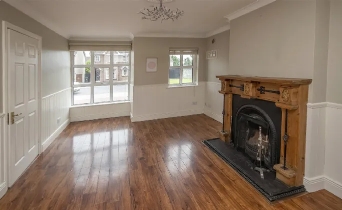 Living Room 4.83m x 3.66m High quality laminate walnut floor, walls painted & timber sheeted to dado level, two windows to the front with blinds, centre light, open fireplace, tv pt.