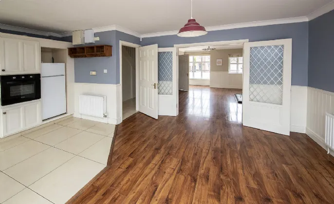 Kitchen/Dining 3.96m x 5.64m Floor tiled in kitchen, high quality walnut in dining, walls painted, windows to the rear, sliding glass door to the rear garden, two centre lights, cream fitted kitchen, telephone pt., tv pt.